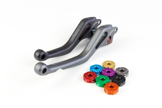 Die Hebel sind in anthrazit und in schwarz matt gestrahlt mit farbigen Verstellrädern.