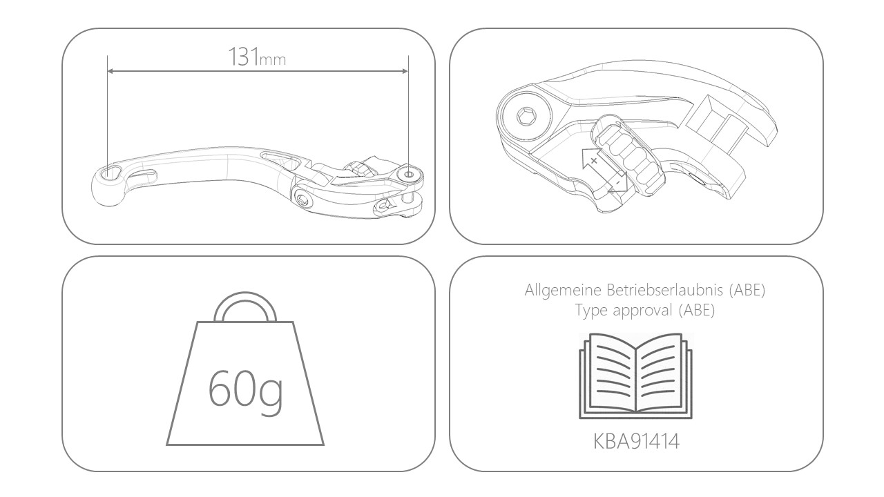 Dank der 25-fach einstellbaren Griffweite lässt sich der Hebel optimal an die eigene Handgröße und den gewünschten Abstand zum Lenker anpassen. Das klappbare Design verringert zusätzlich das Risiko eines Hebelbruchs, sollte das Motorrad umfallen oder im Stand stürzen.